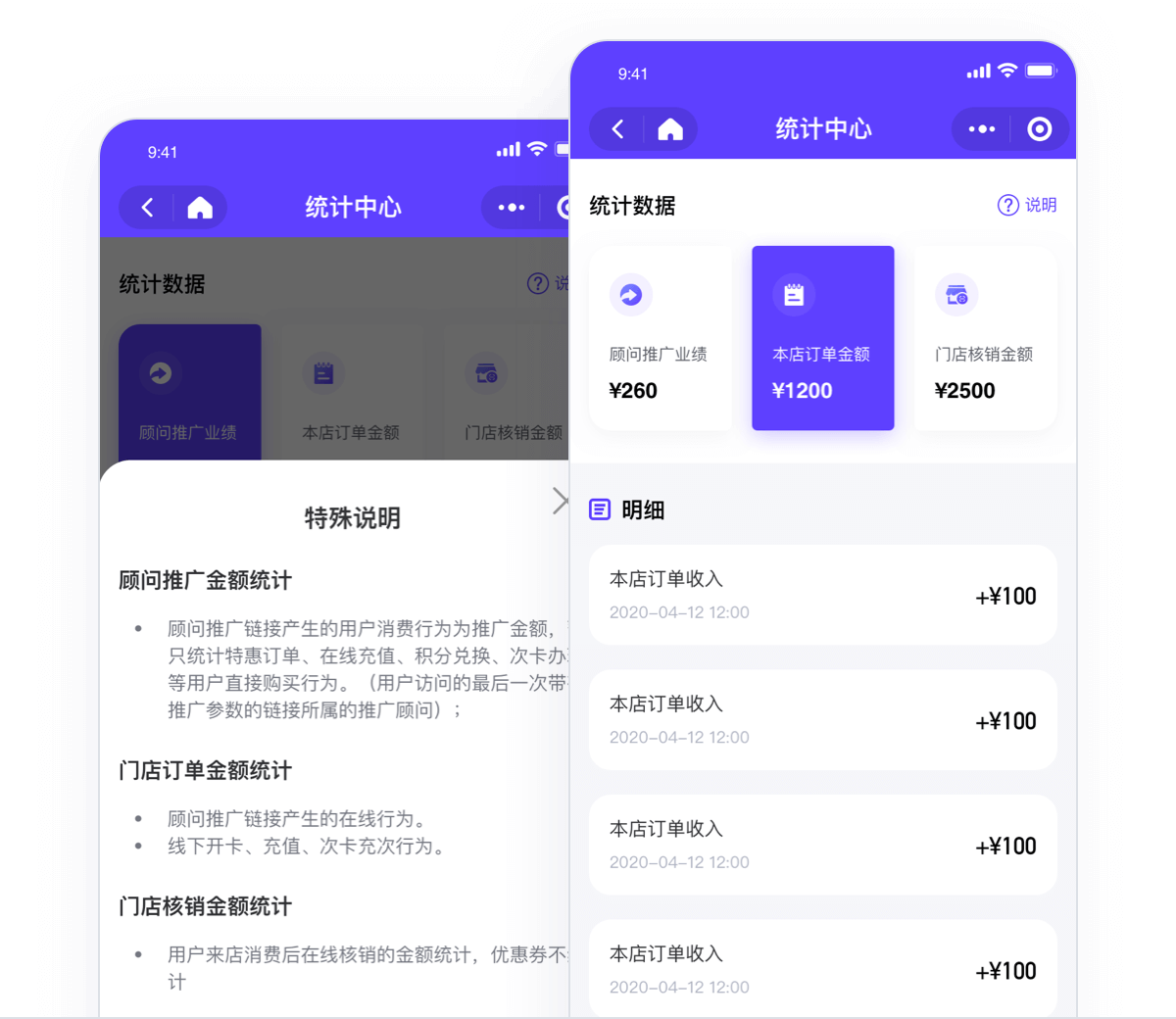 店长可查看所管理门店的相关数据以及明细,包括顾问推广业绩、本店订单金额、门店核销金额