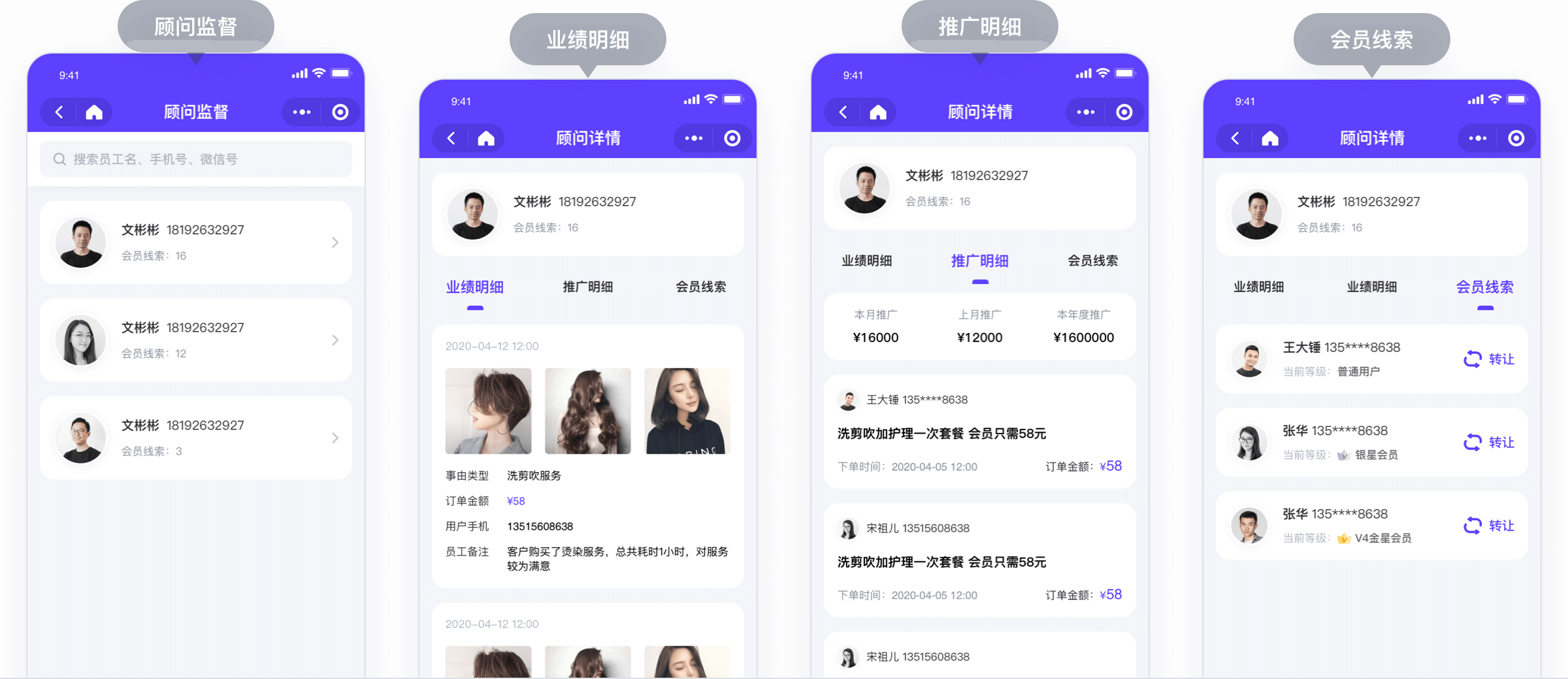 店长可查看顾问的业绩明细、推广明细、会员线索,可单独转让顾问的会员