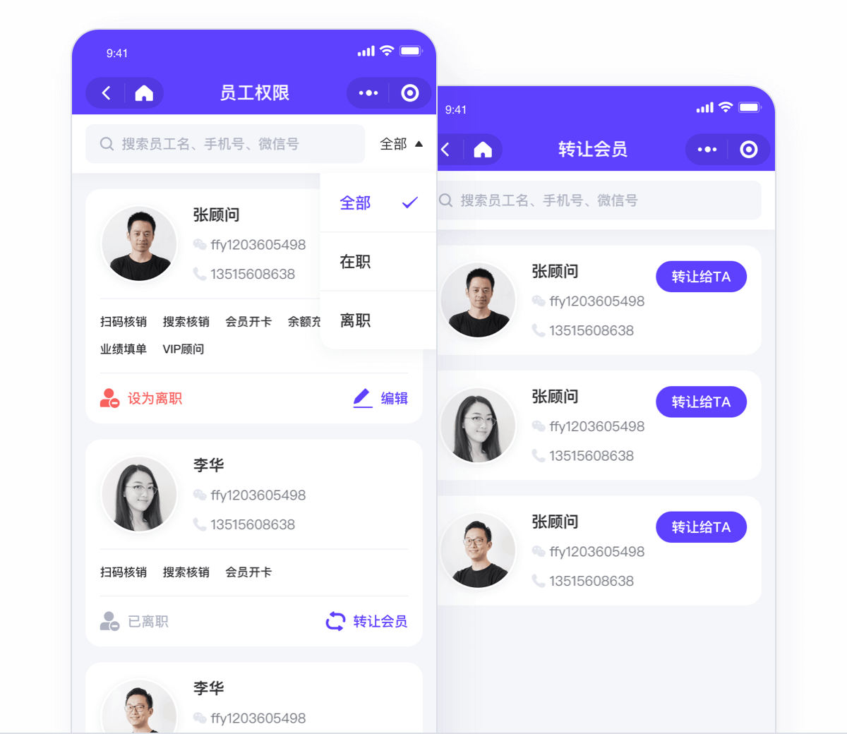 店长可对员工进行编辑、离职、转让会员、添加操作;