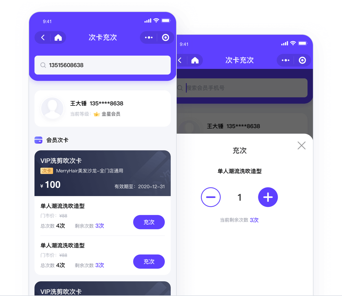 店长管理员也可以给本店用户会员的次卡套餐进行充值;
