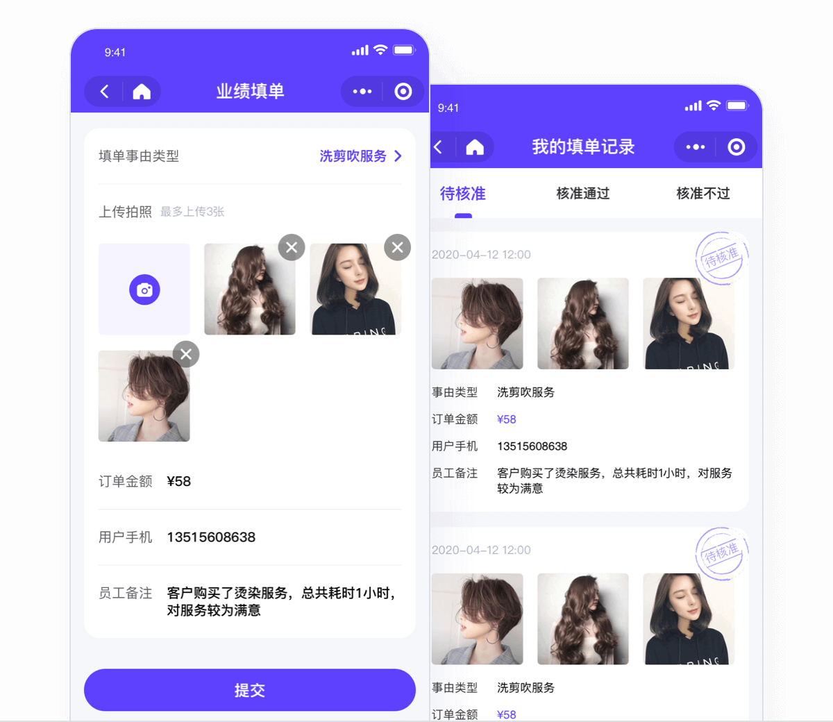 员工可在微信小程序端提交自己的业绩,填单需要选择事由类型、上传拍照、设置订单金额、用户手机号和员工备注。