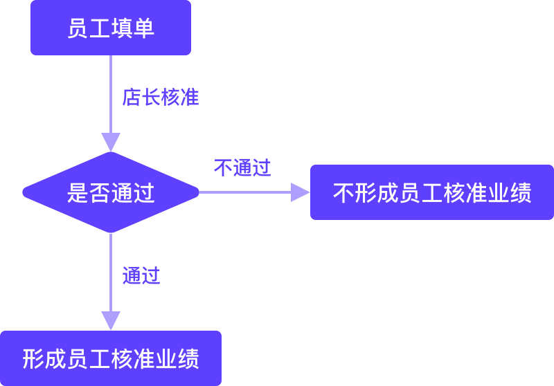员工提交业绩填单 > 店长收到待核准订单 > 核准通过/不通过;