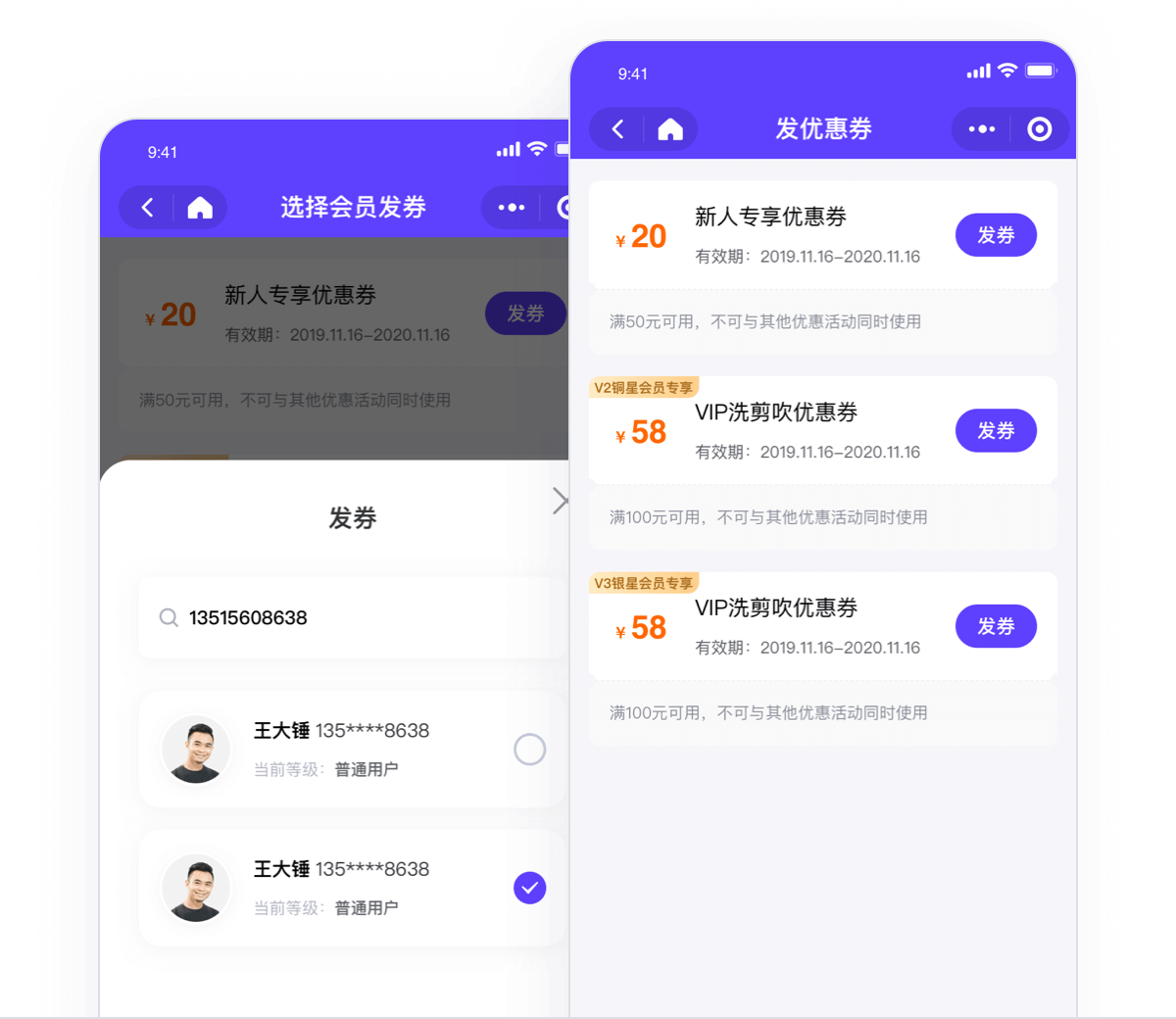 发券流程:选择优惠券 > 搜索本店会员 > 可选多个会员发券